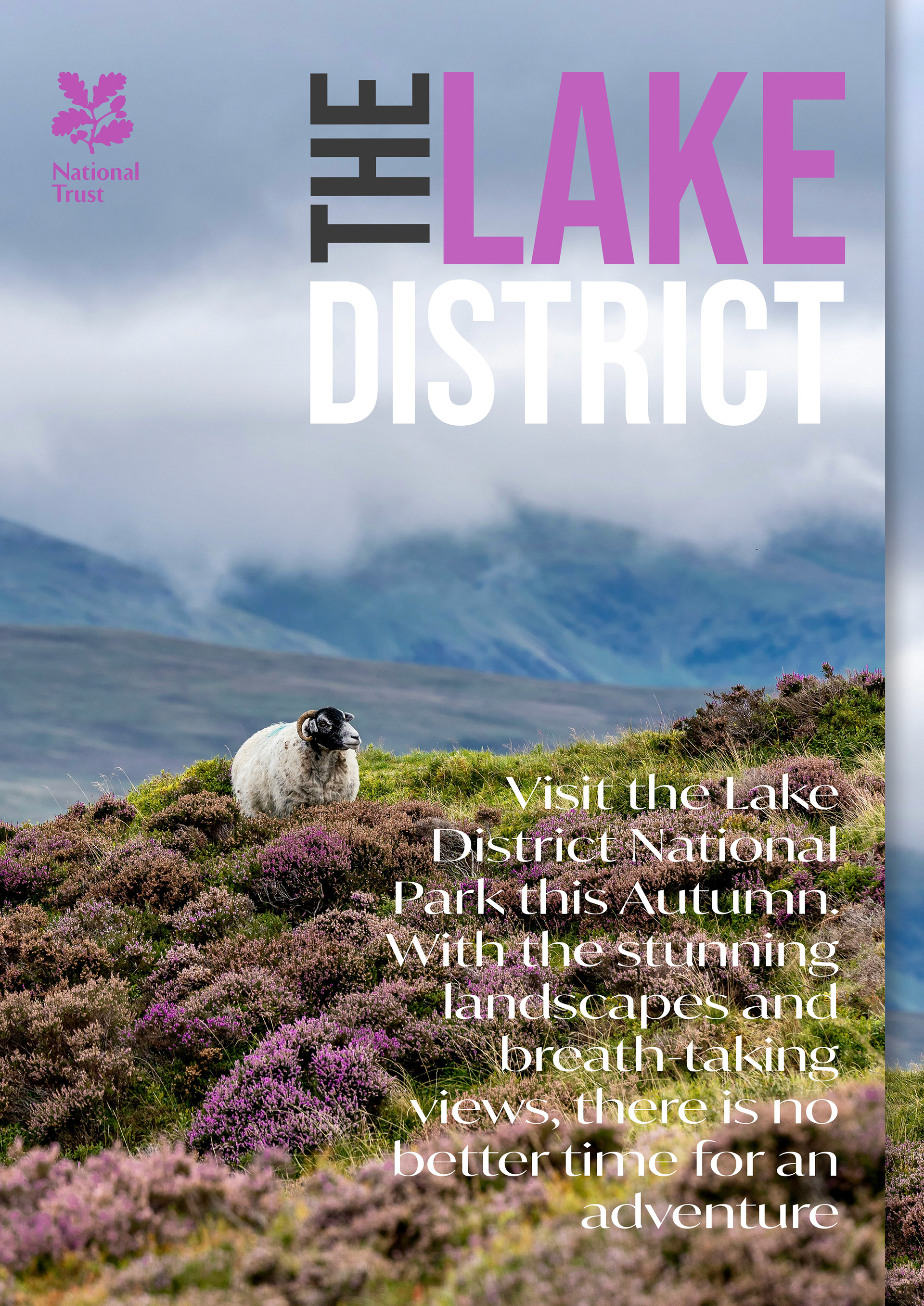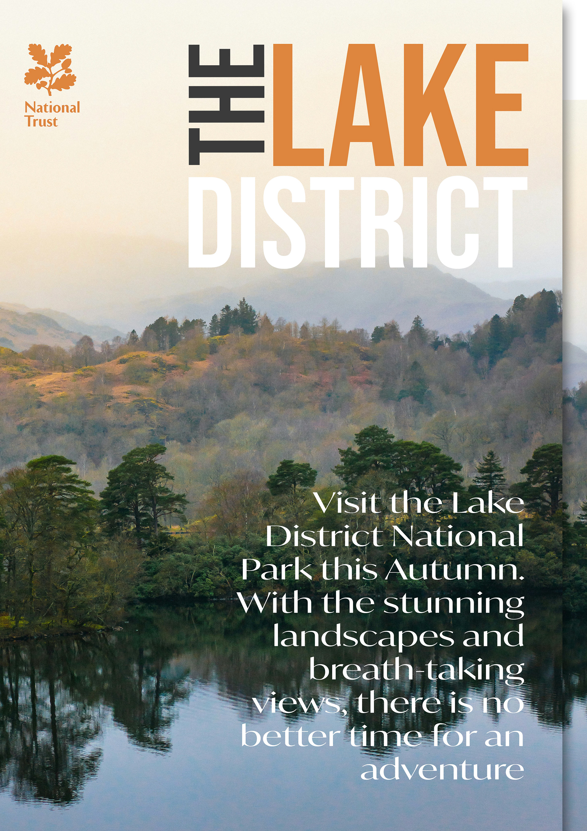 For this National Trust concept project, I designed a pair of posters promoting autumn visits to the Lake District, each showcasing the region’s dramatic scenery through a distinct visual style. Both posters highlight iconic landscapes transformed by the season-rich foliage, misty valleys, and golden light-but interpret them through two contrasting colour approaches: one warm and earthy, emphasising the cosiness of autumn wanderings, and the other cool and atmospheric, capturing the crisp clarity of early fall. The typography is clean and understated, allowing the landscapes to take center stage while reinforcing the National Trust’s trusted, heritage-driven identity. Together, the posters offer complementary perspectives that celebrate the beauty and diversity of the Lake District in autumn.