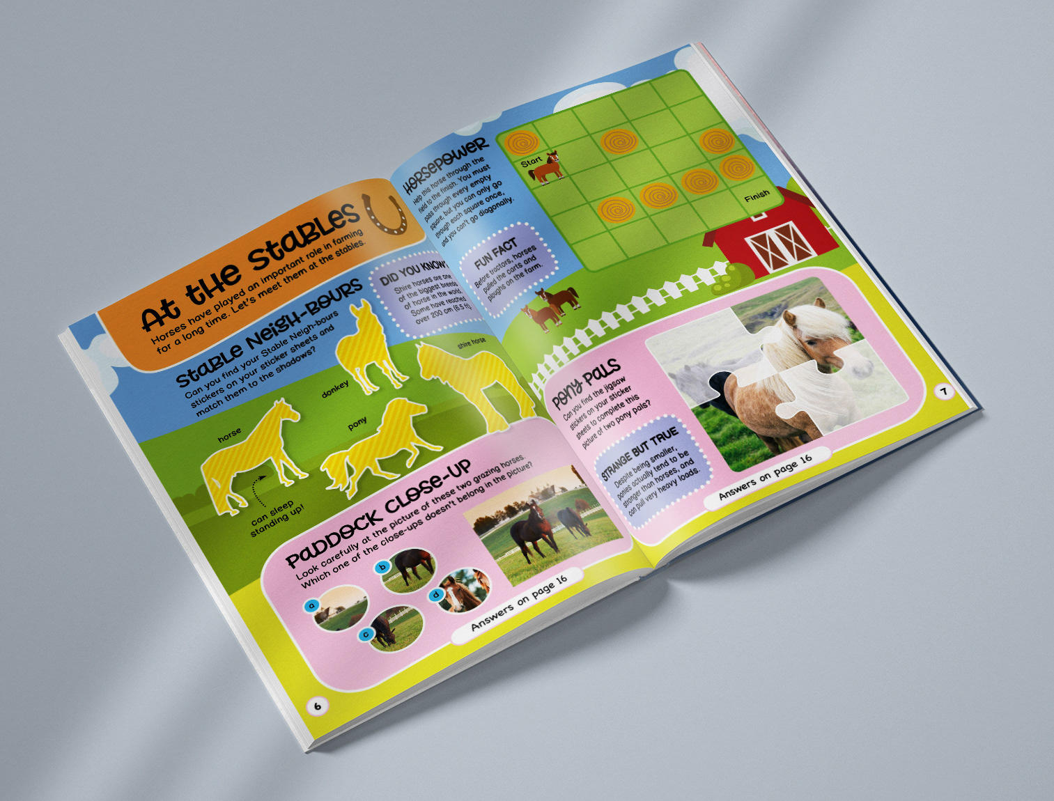 For this pair of children’s sticker book activity packs, I designed a playful and practical format that makes creativity easy to take on the go. Each pack, one themed around animals and the other focused on colour-by-numbers, contains three coordinated books filled with engaging activities, vibrant illustrations, and themed sticker sheets. I developed distinct visual identities for both packs, using lively palettes, friendly character art, and unique typography that support independent play for young users. The outer packaging features a rope carry handle and a hook and loop closure tab, which I designed to feel both durable and fun, enhancing the sense of a portable creative kit.
